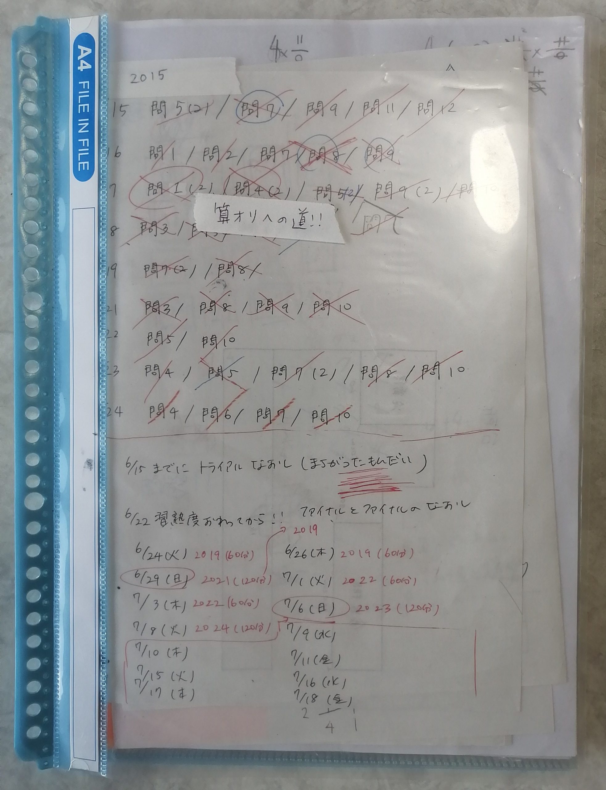 答案や解きなおし等を妻がファイリングしていました。こういうことをきっちり行うとうまくいく確率が少し上がると思います。