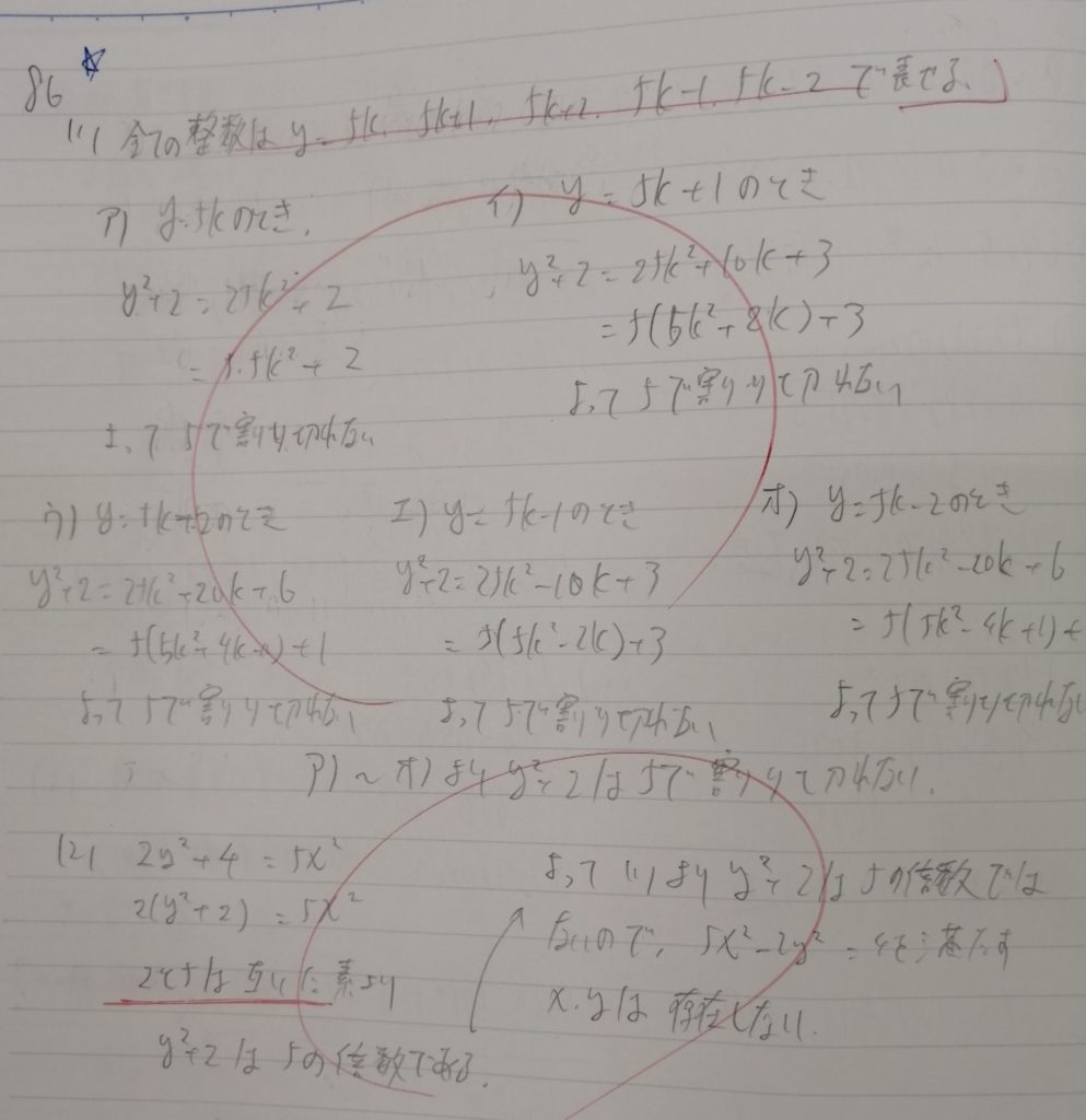 整数問題です。(1)は少し大げさな表現を用いるなら、この世に存在するすべての整数を「5で割った余り」で分類します。5種類に分類できますね。後は5つそれぞれを条件に代入すれば終わりです。非常に基本的な問題ですが、この「5で割った余りで分類する」こと自体を思いつかない生徒もいます。(2)は(1)で証明したことを用います。(1)を用いること自体はわかっていても、どう用いてよいのかわからない生徒もこれまでいました。この生徒はしっかり思考して正解にたどり着いています。画像の赤線分に注目してください。「2と5は互いに素より」の部分です。予習の段階でこれを書いていない生徒も少なくありません。本番では減点でしょう。仮に「互いに素ではなかった場合」は証明不可能だからです。この辺りの厳密さを備えていないと、将来難問に出会ったときに何をしていいのかわからなくなります。厳密に考えためには、深いところまで数学がわかっていないといけません。それを毎週の授業中の添削で身につけてほしいと思います。