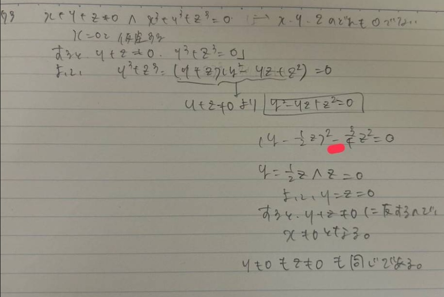 証明問題です。一見正解しているように見えます。しかし、赤線の部分が間違いです。論理的に正しくありません。以前、受講生が他塾の復習テストの添削結果を見せてくれたことがありましたが(レイブリックと他塾を掛け持ちしていました)、間違いの箇所をスルーして丸になっていました。先々のことを考えると生徒にとってはよくないですね。「正しいことに真摯に向き合う」姿勢が特に理系教科では大切です。その姿勢が丸暗記に走らない学習姿勢に繋がり、応用の利く思考力を生み出します。この答案を書いて「良し」としているということは、深く「意味」を考えながら問題を解いていないことがわかります。課題が見つかりました。より正確に表現するなら、以前から課題としていたことがまだ完全には改善されていないことがわかりました。だから、具体的に頑張れるのだと思います。