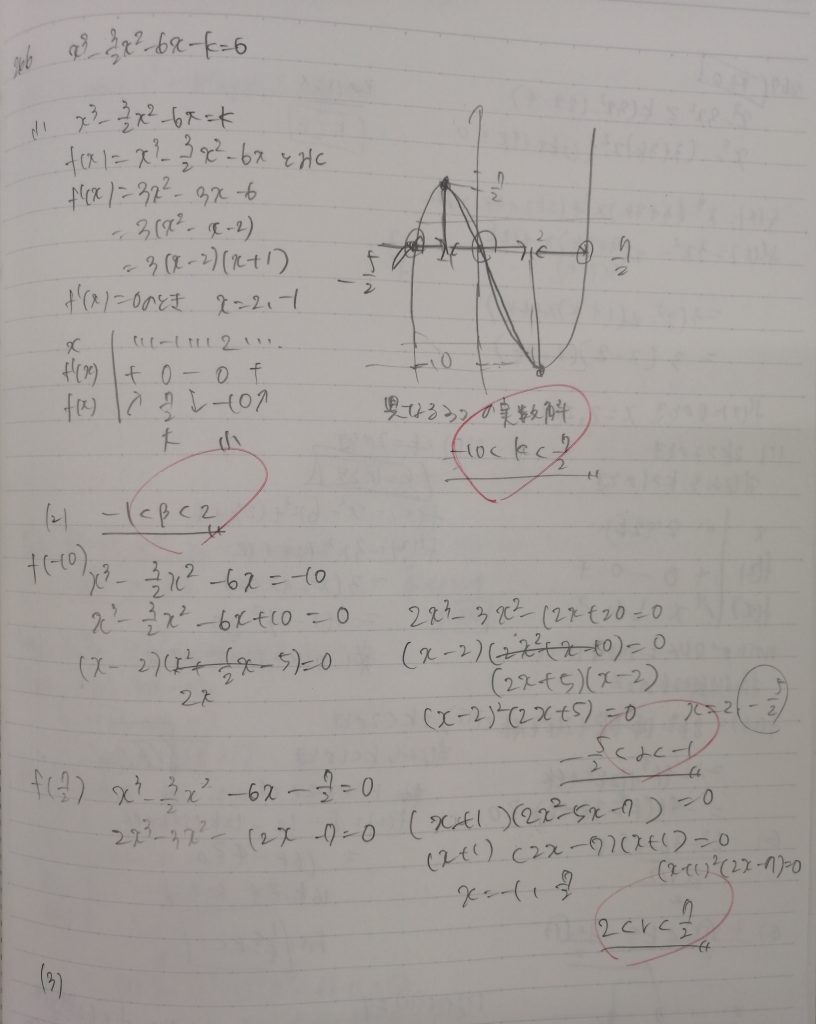 微分の問題です。前半はグラフを利用して解きます。体験授業などで初めて予習してもらった生徒は、このレベルの問題は解けずにノートが空欄になっていることが多いです。高1生だけでなく高2生も同じです。それらの生徒のほとんどの生徒は大手予備校や難関大学専門の塾に通っています。話を聞くとやはり今通っている塾予備校では予習より復習を重視しているようです。体験授業授業の後、当コースの指導を継続すると早い段階でこのレベルの問題は自力で解けるようになります(さらに難しい問題が解けるようになるためには相当訓練が必要ですが)。要は考える力がなかったのではなく、考えることをしてこなかっただけなのです。考えるコツや楽しさを知るとスムーズに伸びていきます。(3)はこの生徒も空白でした。核心からかなり離れたヒントを伝えてじっくり考えてもらうと、15分後に自力で正解させてくれました。この日は久しぶりに調子がよかったです。次週も楽しみです。