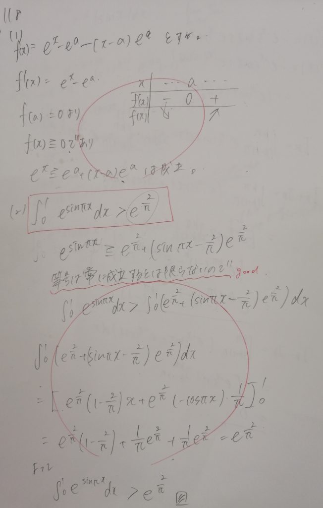 数Ⅲの微積の問題です。(1)は微分です。難しくありません。(2)は(1)で証明した不等式を用いて解き進めます。京都大学にしては穏やかな問題です。この生徒も難なく正解させています。この生徒は今一番勢いがあるかもしれません。数ⅠAⅡBの標準問題(計200問ジャスト。それに加えて数Ⅲの問題も扱っています)を受講から4ヵ月で終わらせました。ただハイペースなだけではありません。先日4ヵ月間に学んだ問題の総復習テストを行いましたが見事合格しました。復習もしっかりできています。当コースではやる気のある生徒はどんどん先に進むことができます。次は数Ⅲですね。半年以上前から受講している同学年の生徒にぜひ追いついてほしいですね。