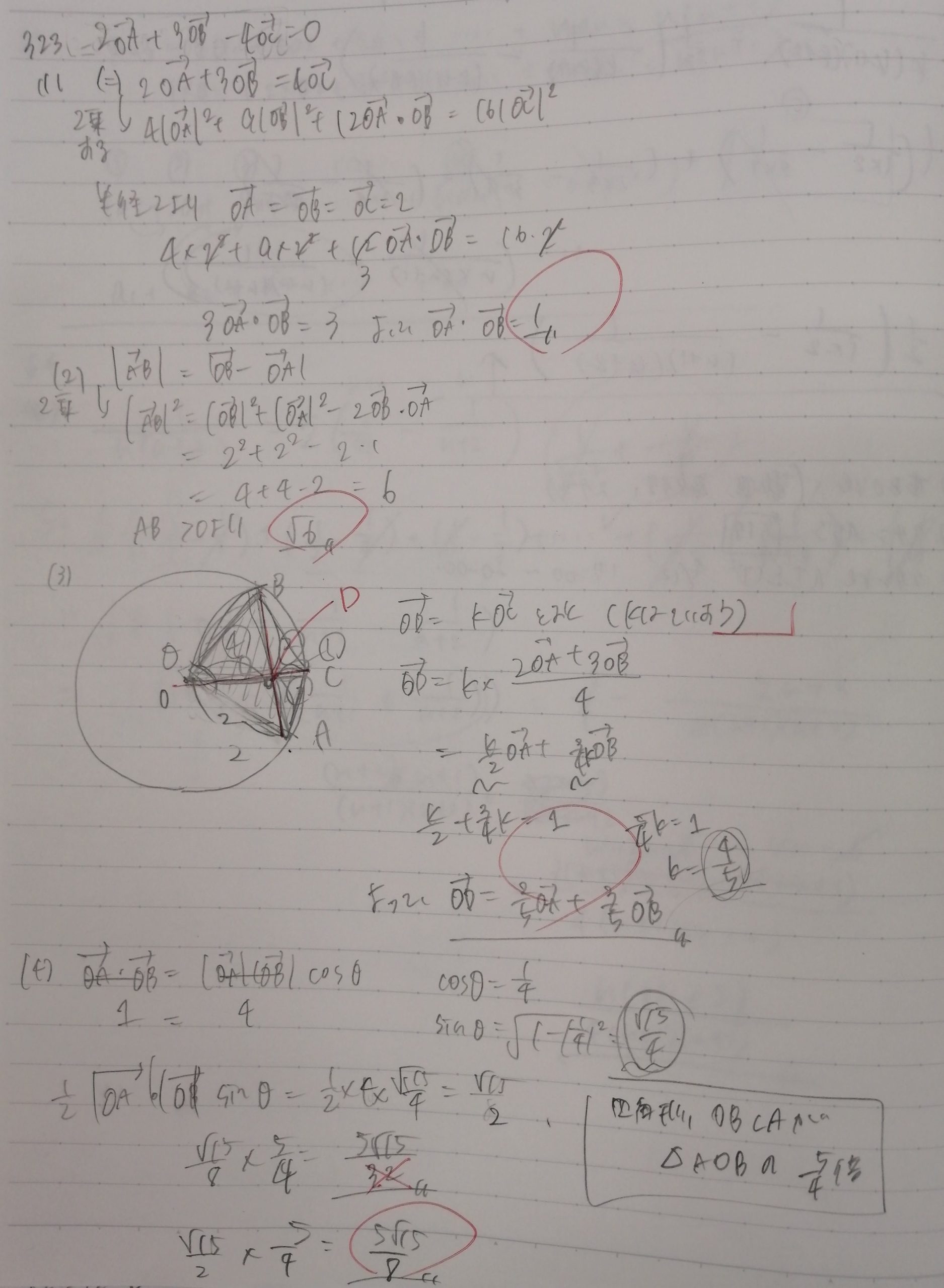 ベクトルの問題です。この生徒は学校ではまだベクトルを習っていません。(1)はベクトルの定石のひとつ「困ったときは二乗する」ですね。先週できなかったことができるようになっています。(2)はかんたんです。注目すべきは(3)です。ベクトルの定石のひとつとして「複数の関係式を作って解く」というものがあります。文字を用いて見事に解いています。「係数の和が1」という考え方も使えています。完璧です。(4)は予習の時点では不正解でした。理屈に合わないことをしていました。これがこの生徒の弱点です。ベクトルのみならず他の分野でも同じようなことをすることがあります。ノーヒントで考え直してもらったところ正解しました。そのあと改めて予習答案を確認してもらったところ、自分が理屈に合わないことをしていたことに気づいてくれました。自分で気づくことが大切です。この生徒は他の生徒に比べて難問を前にしてもあまり気後れしません。果敢にチャレンジします。予習答案でも難問の正答率は比較的高いです。みんなが正解させる問題での取りこぼしを防ぐことができればさらに高いレベルで成績が安定するはずです。
