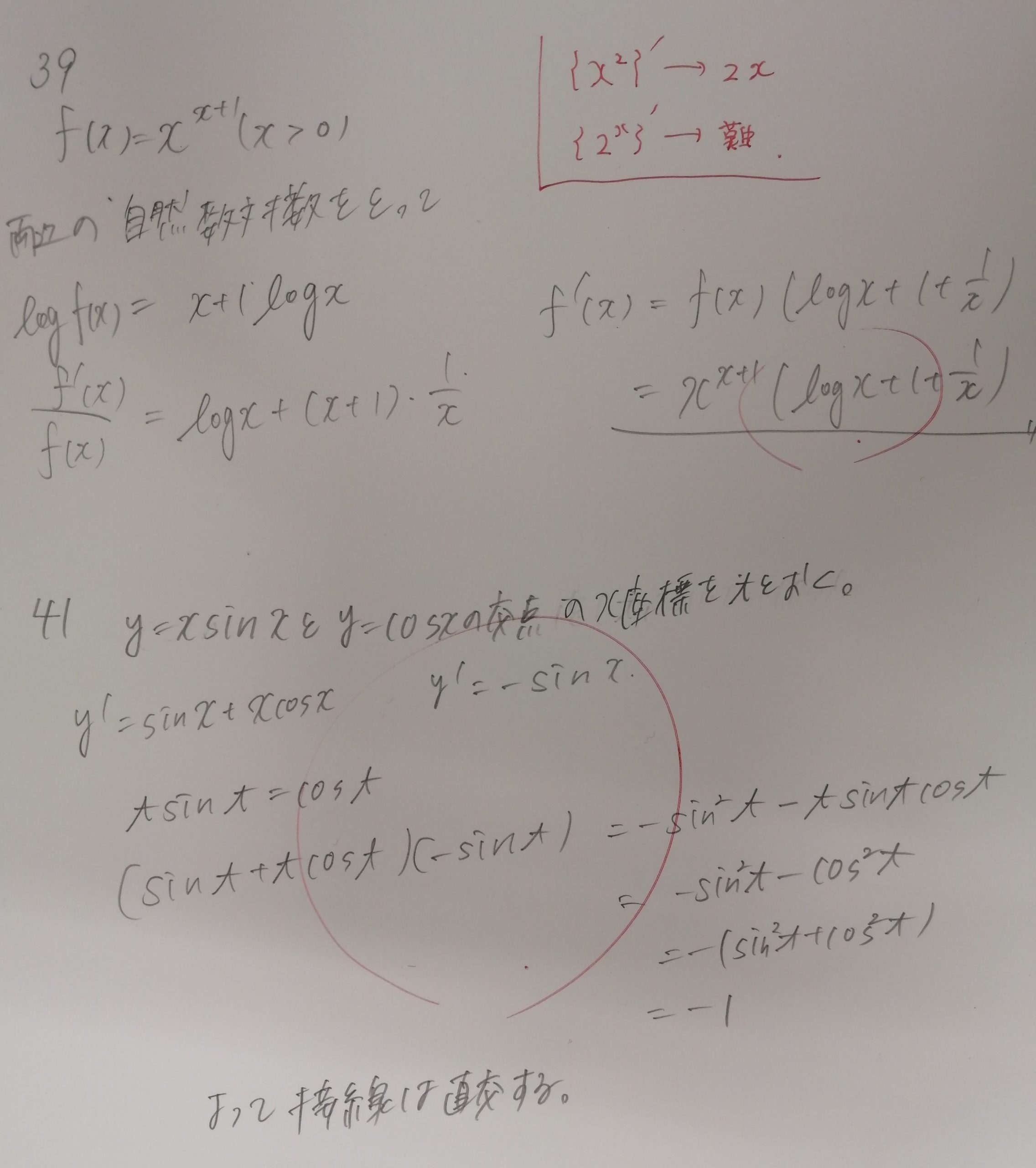 先月受講を開始した生徒です。入試本番まで時間がないので、数Ⅲの基本問題から大急ぎで解いてもらっています。この2問は完璧に解けていますね。この日はそれ以外にもたくさんの問題を予習してもらっていましたが、65%程度は解けていました。解けない問題は授業中にヒントを伝えて再チャレンジしてもらいましたが、そのときはサクサク解いていました。かなり能力が高い生徒だと思います。今後もハイペースで進んでいければと思います。