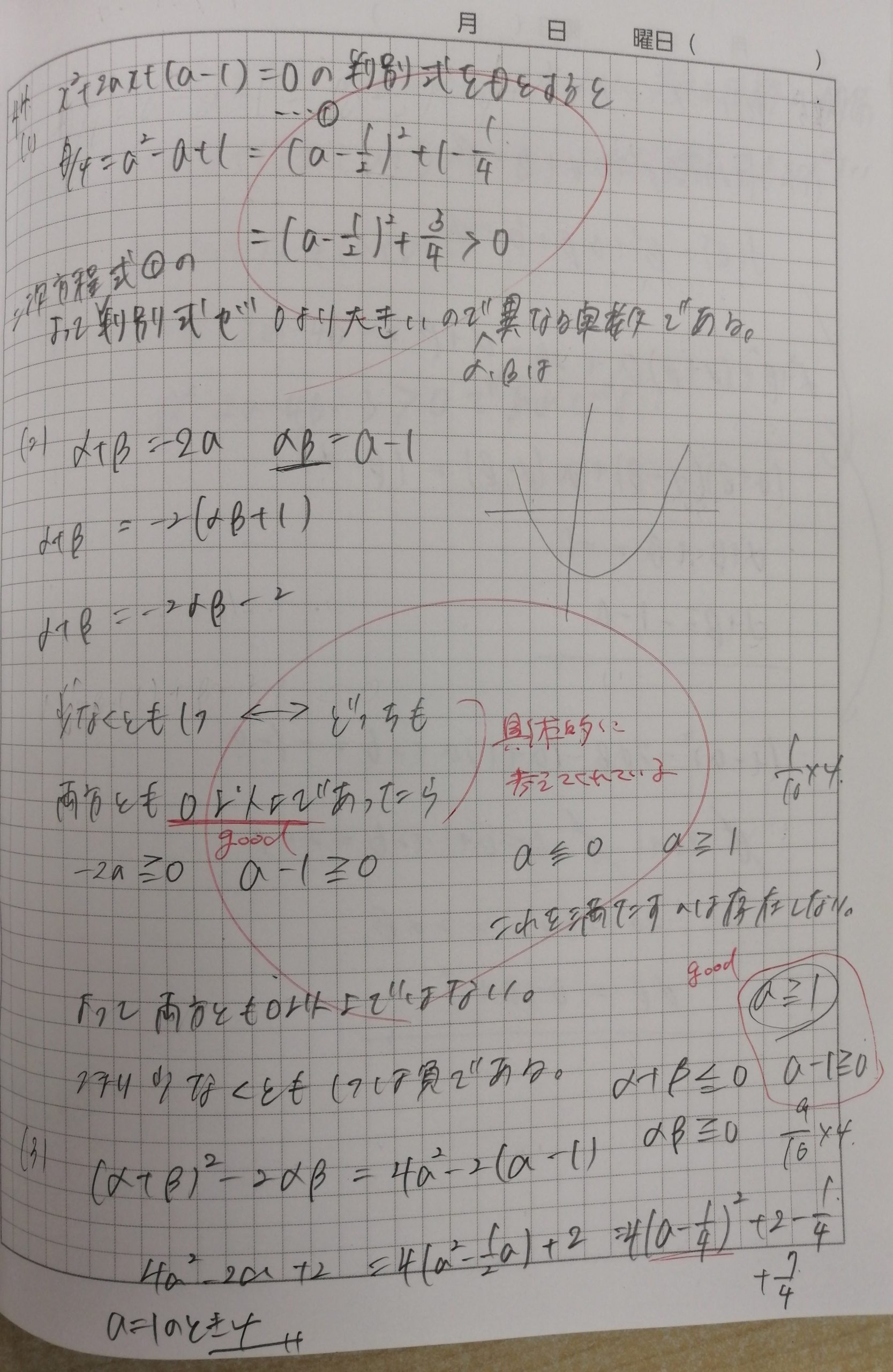 体験授業でもこの問題を出すことが多いのですが、ほとんど当たりません。易しいようで正解しにくい問題。この生徒は初見で正解させています。何のヒントもなく背理法に気づき、「負ではない」の同値を「正」とせずに「0以上」とできています。最後の最小値を求めるところでも、軸が範囲に入っていないことに気づいて答えを出しています。途中の説明も簡潔かつ丁寧です。完璧ですね。ただ、この日の他の問題で少しミスが目立ちました。次回はなるべくミスをなくすように伝えましたが、どうなるでしょうか。楽しみです。