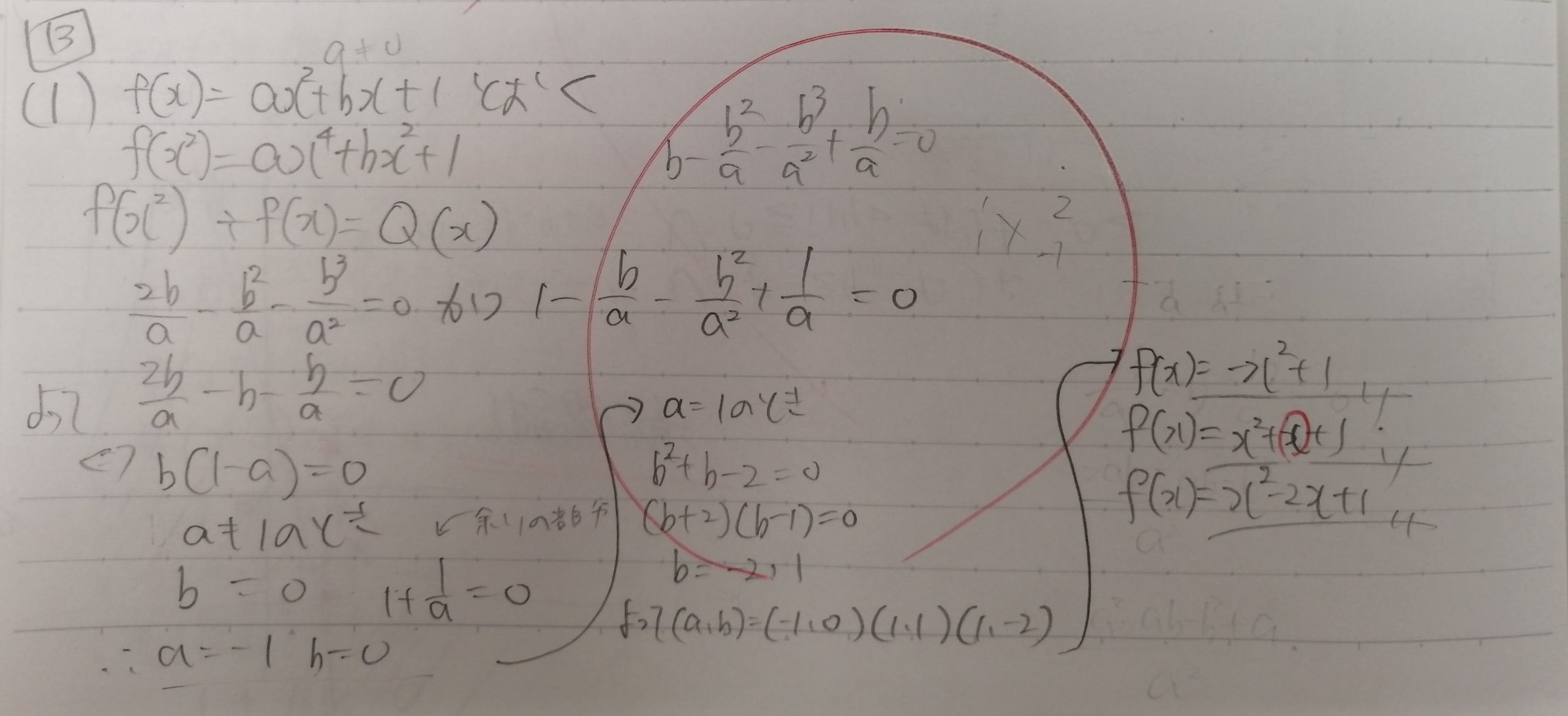 数Ⅱの「式と証明」の問題です。「f(x2)がf(x)で割り切れるような二次式f(x)をすべて求めよ」と問題文に書いています。まず、f(x)を3つの文字で表し、f(x2)を作ります。次に、問題文の指示通り、f(x2)をf(x)で割ります。すると「余りらしきもの」が出てきます。条件より余りは0ですから、xの恒等式と見て、「xの一次の係数=0⋀定数項=0」として解き進めれば正解です。その際、場合分けが必要です。初中級者はとにかく場合分けが苦手です。数学に自信を持っている高校生でも、場合分けができていないことが少なくありません。問題集で一度解いたものについてはできるのですが(だから定期考査では取れる)、それは「この問題は場合分けが必要だ」と覚えているからでしょう。初見の問題で正確に場合分けができないと模試や本番では通用しません。習った問題を復習しているだけでは覚束ないです。誰からのヒントなしに、自力で場合分けを行い、解ききる経験を積んでいく必要があります。