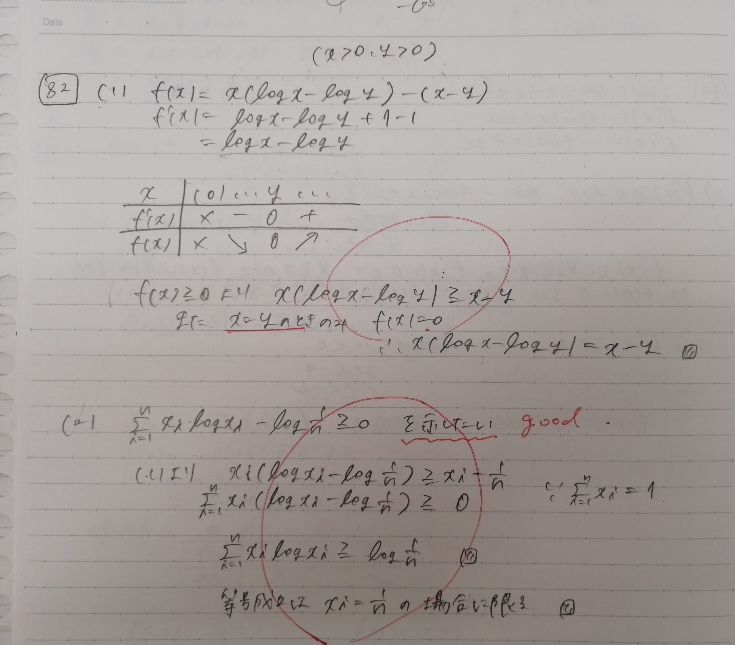 数Ⅲの微分です。(1)は、Xを変数、yを定数と見て微分しています。(2)は意外と難しいです。この生徒は非常にシンプルに解いていますが、歴代の医学部合格者でも初見では解けないことが結構ありました。頼もしいですね。画像中、赤ペンでgoodと書いているところに注目してください。「〜を示したい」と書いていますね。これは私の指導を受けている生徒がよく書くフレーズです。私はこれを「タイトル」と呼んでいます。難問を解いていると、自分が何をしているのか、何をすればいいのか分からなくなることがあります。そんなときは、すでに分かっているところまで戻り、できるだけ先を見越しながら、最低限何がわかればいいのかを明確にすると、スムーズに正解までたどり着けることが多いです。このタイトルが予習ノートに登場する回数が増えると、模試の結果も上がってきます。みなさんも試してみてはいかがですか。