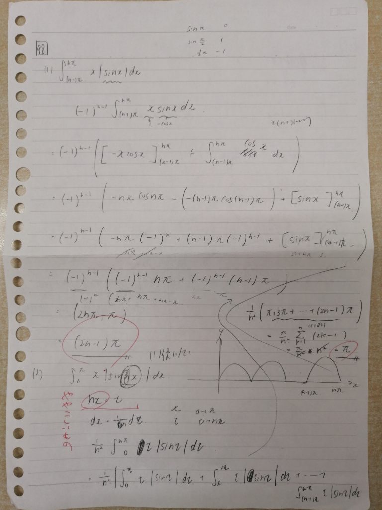 いろいろなエッセンスの入ったいい問題です。まず、積分するために絶対値を外す必要がありますが、定石の(-1)を用いてうまくやっています。次に部分積分。私が教えた、ミスをしない方法を使ってくれています。(2)で一番大切なのは、置換して積分するところです。これはひとりではなかなか気づかないでしょう。普段から答えや指導者の解説に頼らずに自分で考えているからこそです。いつも生徒に伝えていますが、人から気づかされることと、自分で気づくこととは雲泥の差があります。まさに「コロンブスの卵」です。最後に図を描いて効率よく解答を導いています。この生徒は今、伸び盛りです。