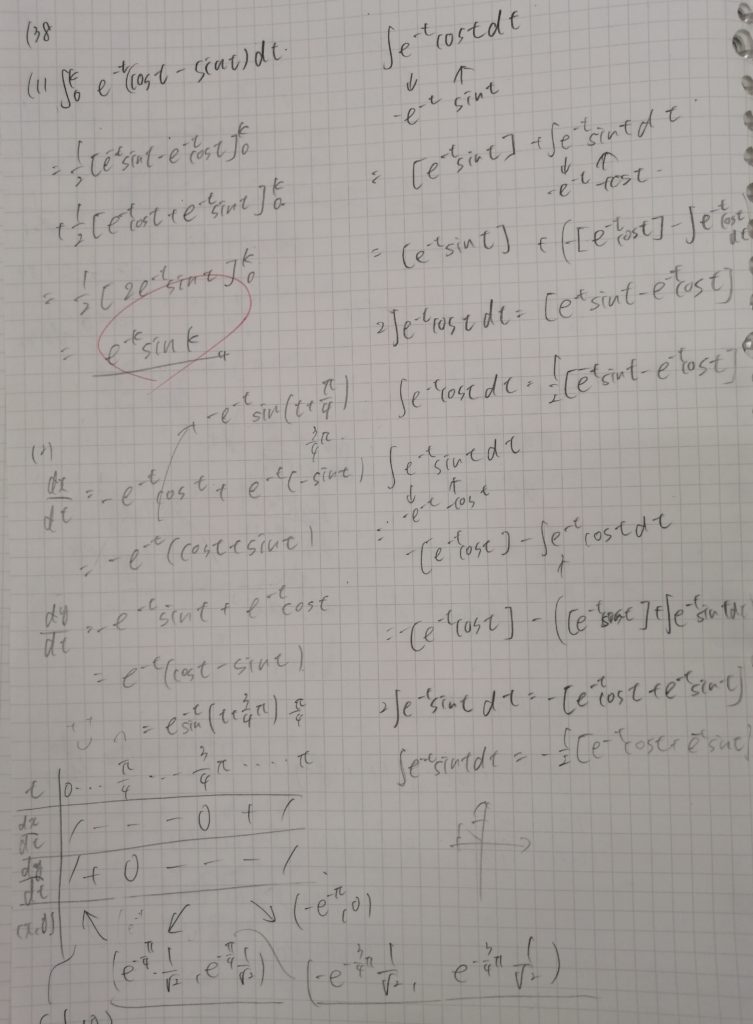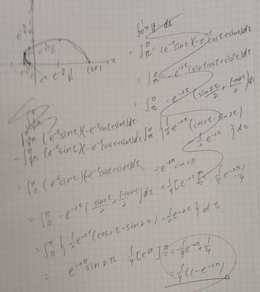 数Ⅲの積分の問題です。(1)は簡単な積分の計算です。(2)は媒介変数tで微分、増減表の作成、グラフの作成、グラフの形をもとに立式という手順で解き進めます。下の図のグラフを見ると左下が中に食い込んでいるのがわかります。定番の形です。この部分の面積を引くことができるかどうかがひとつのポイントになります。立式にもコツがあります。まずはxとyで表現するとわかりやすいです。数Ⅱの積分で習ったことなので文系のここまでの立式なら文系の生徒でもできるはずです。その後(2)の条件を利用してすべてのxとyをtに統一します。