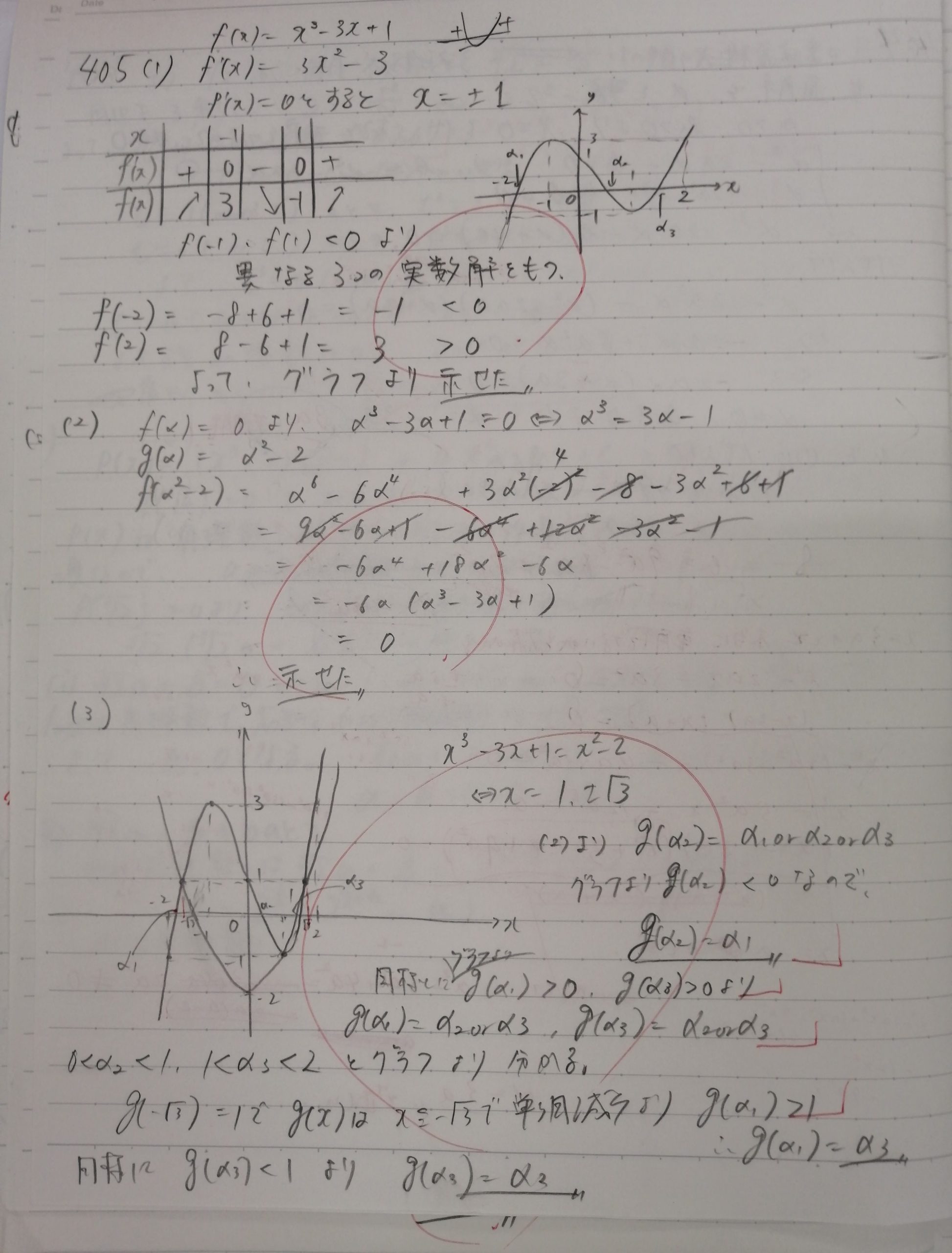 医学部志望者です。調子が悪くなると、式ばかりで入り組んだ解法を選択する癖がありますが、この問題は図を描いてシンプルに考えることができています。(3)ですが、私は2つのグラフを別々に描きましたが、この生徒はまとめて描いていますね。頭が切れる生徒はそれでいいと思いますが、そうでない生徒は私のようにまずは別々に描いて一つひとつのグラフをじっくり観察することをお勧めします。それでも費やす時間はさほど変わりません。初中級者はますは確実に正解させる方法を選択しましょう。