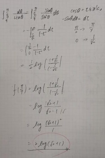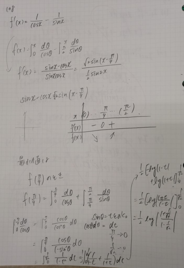 数Ⅲの微積の問題です。前半は最小値を求めるために微分します。増減表を描くと最小値を与えるxがわかります。この「微分する」という発想自体が思いつかない生徒もいるでしょう。後半は前半で求めたxの値を代入し積分します。置換積分がいいですね。この発想も初級者は思いつきません。体験授業等を通して外部の生徒の答案をチェックする機会がありますが、みなさん本当に予習が淡白です。わからないとすぐにあきらめます。ノートを見ると最初の条件だけ書いてそれ以降は白紙ということも少なくありません。そんな生徒でも数ヵ月私の授業を受けるとノートが図や数式で埋められてきます。この生徒はふたつの項を別々に積分しています。上級者ならわかると思いますが実は置換積分を用いれば第1項目を利用して第2項目はかんたんに求められます。今回は確実に正解を導くことを主眼に指導を行ったのでそのことには触れませんでした。今後抜き打ちテストをしたときに説明したいと思っています。