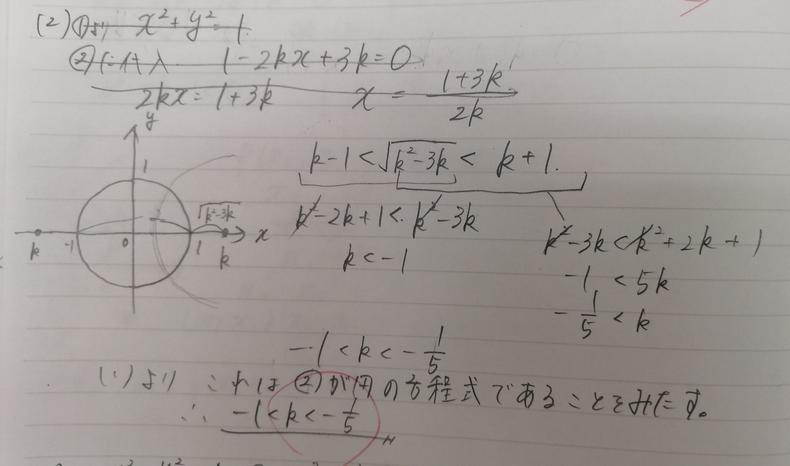 数Ⅱの図形と方程式の問題です。実はこの答案、答えは合っているのですが点数はあげられません。論理的に不十分だからです。毎週多くの生徒の添削を行っていると、このような答案にしばしば出会います。おそらく集団授業では自分の書いた予習答案が論理的に十分なものであるかどうかの検証は行ってもらえないでしょう。その判断力が身につかないまま本番を迎えると…自身の予想得点と大学側が開示した得点との間に大きな開きが出ることになります。もう一度考え直すように伝え、後日正しい解法を確認しました。この生徒、定期考査期間中であるにもかかわらず先週の授業で余分に予習をしてきてくれました。意欲的ですね。伸びる生徒は指導者が指示したこと以外の学習を自発的に行います(もちろん的外れな学習内容ではいけません)。この生徒にはこの姿勢を持ち続けてほしいと思います。