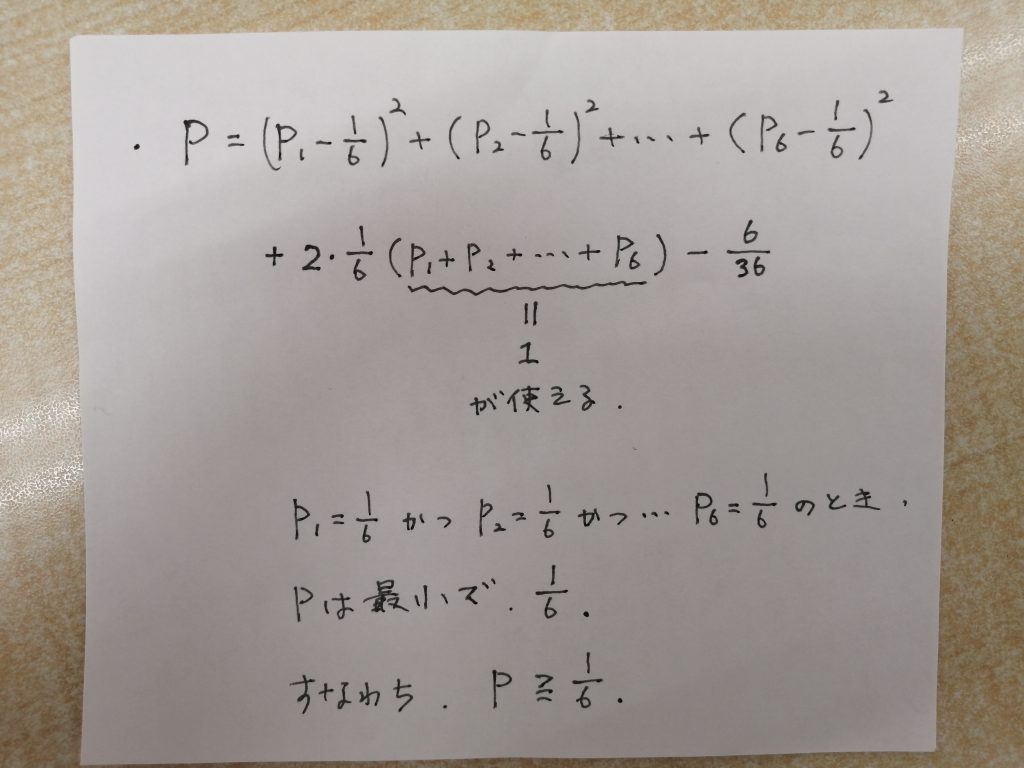 次に、\(P_1\)+\(P_2\)+\(P_3\)+\(P_4\)+\(P_5\)+\(P_6\)=1であることも確認しておきましょう。当たり前ですね。しかし、侮ってはいけません。こういう当たり前なことも、問題用紙か答案用紙の端っこにメモしておきましょう。