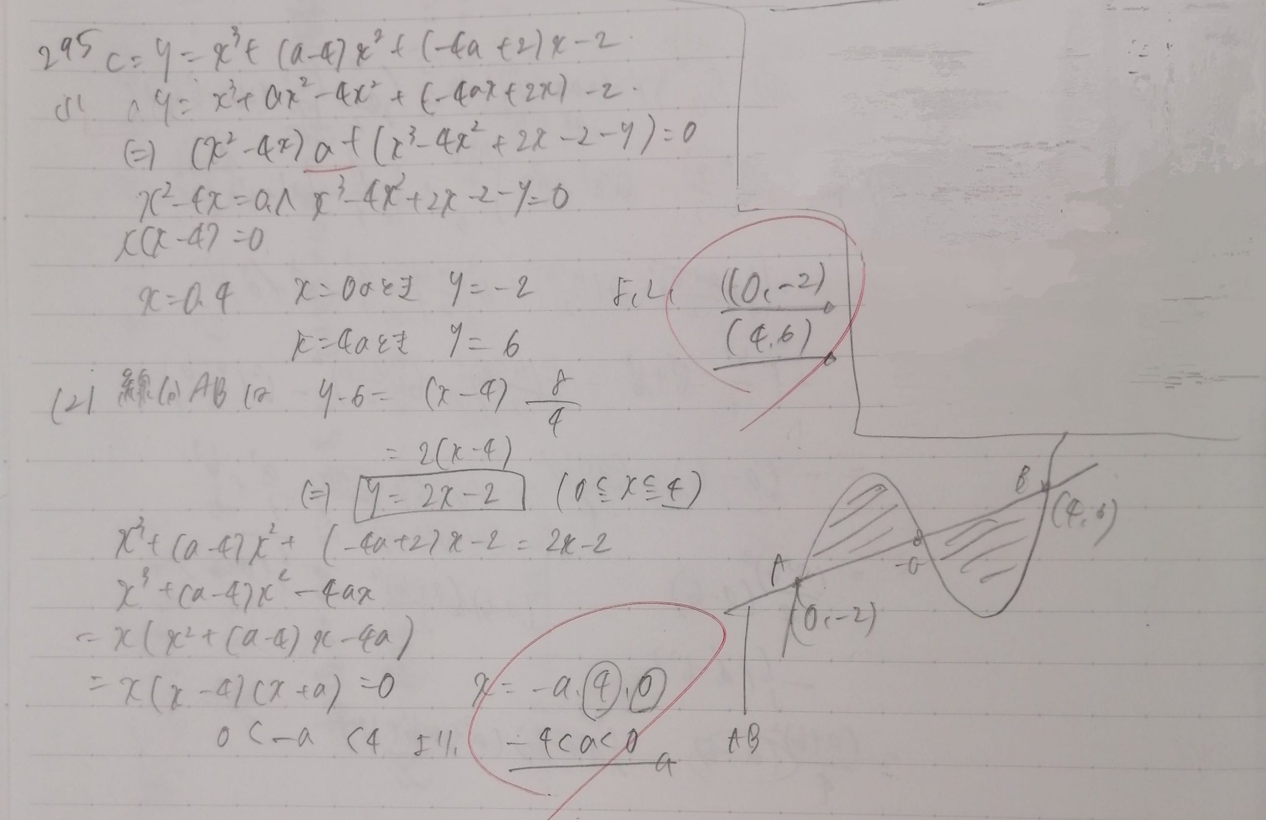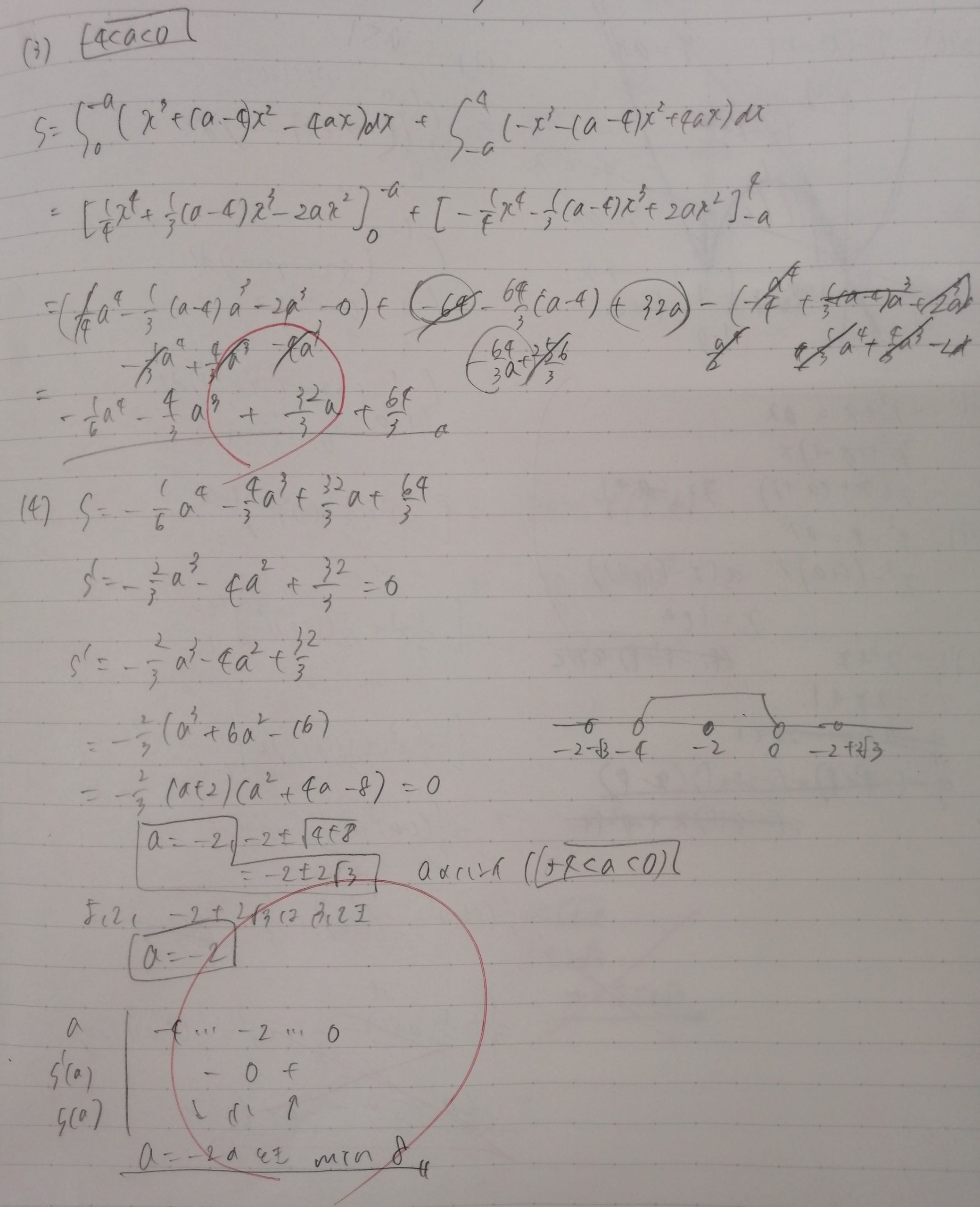 小問で4問もあります。(1)はaについての恒等式だと見抜けば解けます。(2)はグラフと式を用いてしっかり考えられています。(3)は積分の面積計算です。(4)は最小値が問われているので微分で答えを出しています。すべて完璧です。このレベルの問題がスムーズに解くことができれば次は応用問題ですね。それができずに難しい問題に手を出しても上滑りするだけです。当コースは生徒の学力を正確に把握し、その生徒の現状の学力に合った問題を提供しています。
